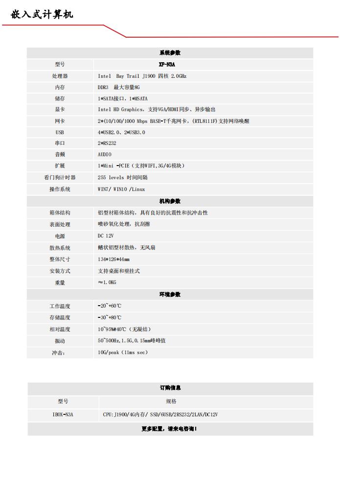 XF-N3A是一款高性价比的无风扇工业计算机,其搭载第四代的Intel Bay Trail J1900 处理器,具有优秀的计算性能和低功耗特性,数据存储方面支持mSATA和2.5寸SSD或硬盘;设计了丰富的通讯接口,2个千兆网口、6个USB2.0端口、2个RS232、电源输入标准DC 12V。小巧轻薄的机身、多种安装方式,使之能适合更多的应用场景。采用全密封箱体结构,防止灰尘进入系统,大面积的铝鳍散热装置,有效地将系统内部的热量快速散发,保证主机的可靠性和更长的使用寿命。