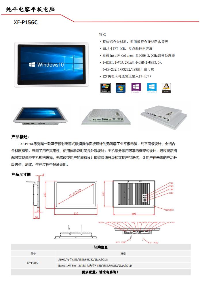 XF-P156C系列是一款基于投射电容式触摸操作面板设计的无风扇工业平板电脑,纯平面板设计、全铝合金材质框架,兼顾了用户实用性、使用体验及时尚是外观设计;主机部分采用可靠的框架式设计,通过灵活搭配可实现多种主机规格选择,无需改变用户的原有设计即能快速升级和实现产品迭代,让用户在未来的产品升级选型、测试、生产过程中畅通无阻。