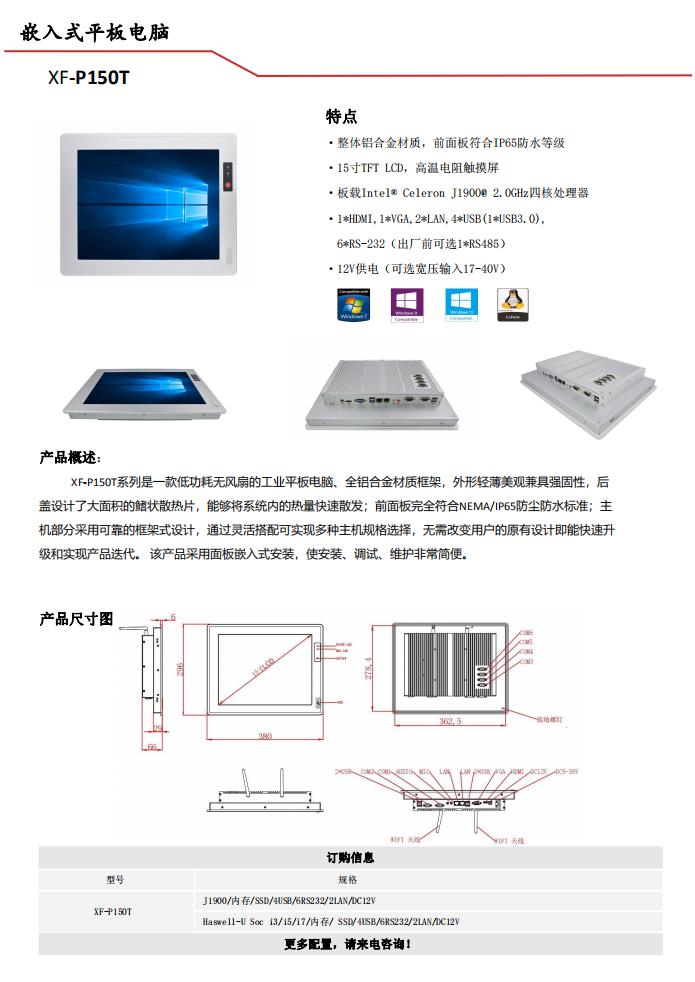 XF-P150T系列是一款低功耗无风扇的工业平板电脑、全铝合金材质框架,外形轻薄美观兼具强固性,后盖设计了大面积的鳍状散热片,能够将系统内的热量快速散发;前面板完全符合NEMA/IP65防尘防水标准;主机部分采用可靠的框架式设计,通过灵活搭配可实现多种主机规格选择,无需改变用户的原有设计即能快速升级和实现产品迭代。该产品采用面板嵌入式安装,使安装、调试、维护非常简便。
