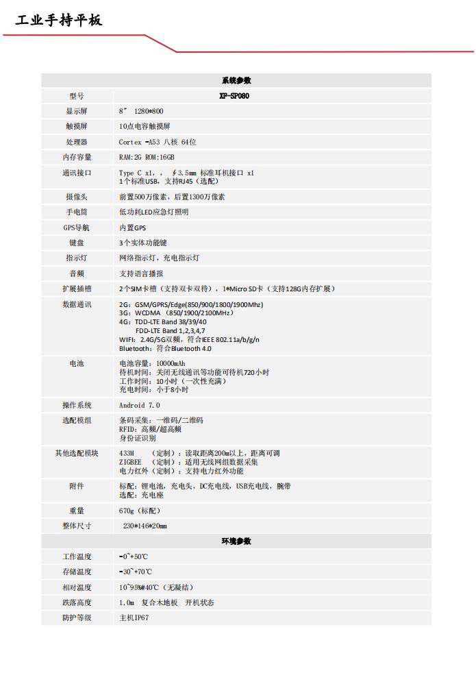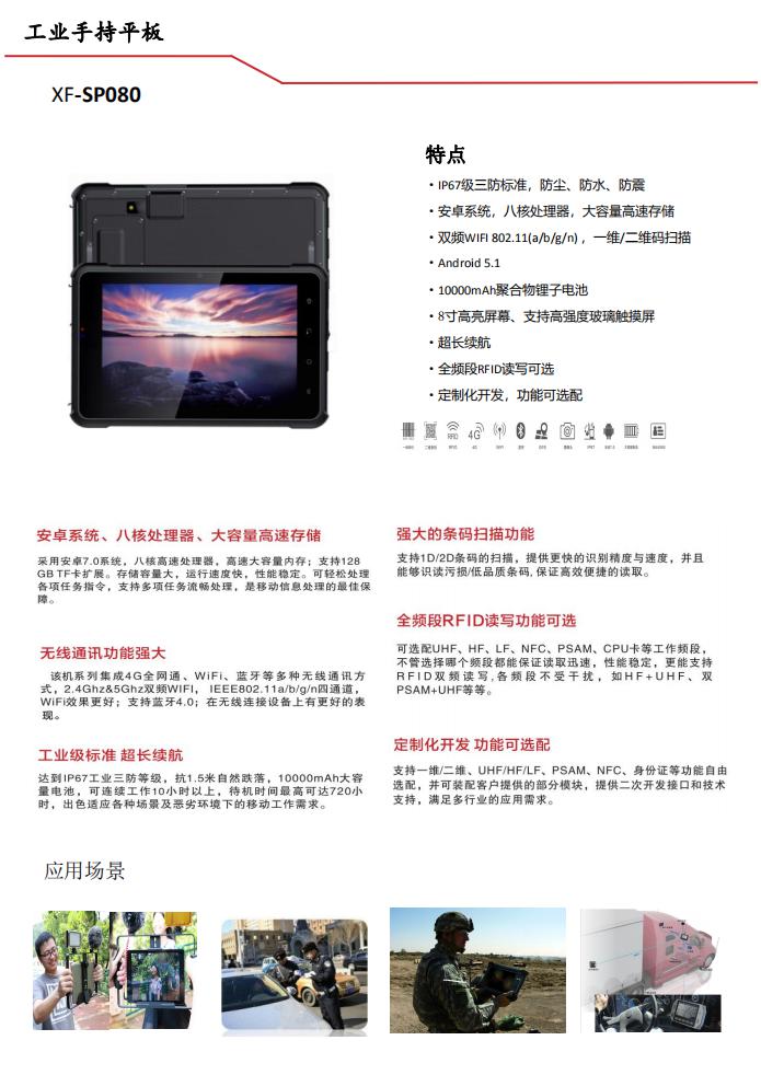 ·IP67级三防标准,防尘、防水、防震·安卓系统,八核处理器,大容量高速存储·双频WIFI 802.11(a/b/g/n) ,一维/二维码扫描·Android 5.1·10000mAh聚合物锂子电池·8寸高亮屏幕、支持高强度玻璃触摸屏·超长续航·全频段RFID读写可选·定制化开发,功能可选配