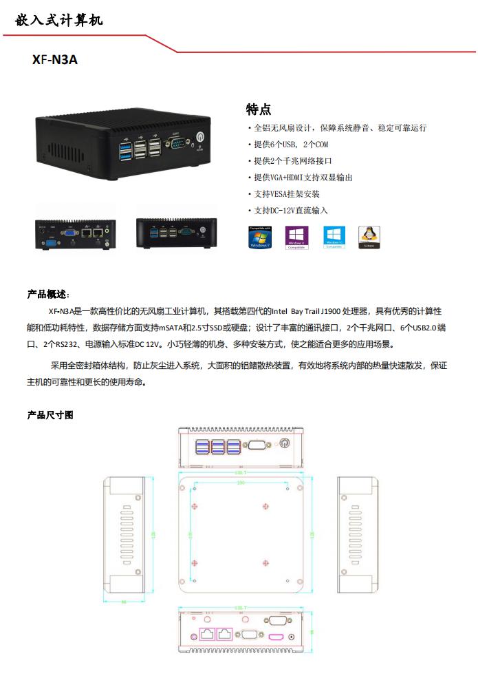 XF-N3A是一款高性价比的无风扇工业计算机,其搭载第四代的Intel Bay Trail J1900 处理器,具有优秀的计算性能和低功耗特性,数据存储方面支持mSATA和2.5寸SSD或硬盘;设计了丰富的通讯接口,2个千兆网口、6个USB2.0端口、2个RS232、电源输入标准DC 12V。小巧轻薄的机身、多种安装方式,使之能适合更多的应用场景。采用全密封箱体结构,防止灰尘进入系统,大面积的铝鳍散热装置,有效地将系统内部的热量快速散发,保证主机的可靠性和更长的使用寿命。