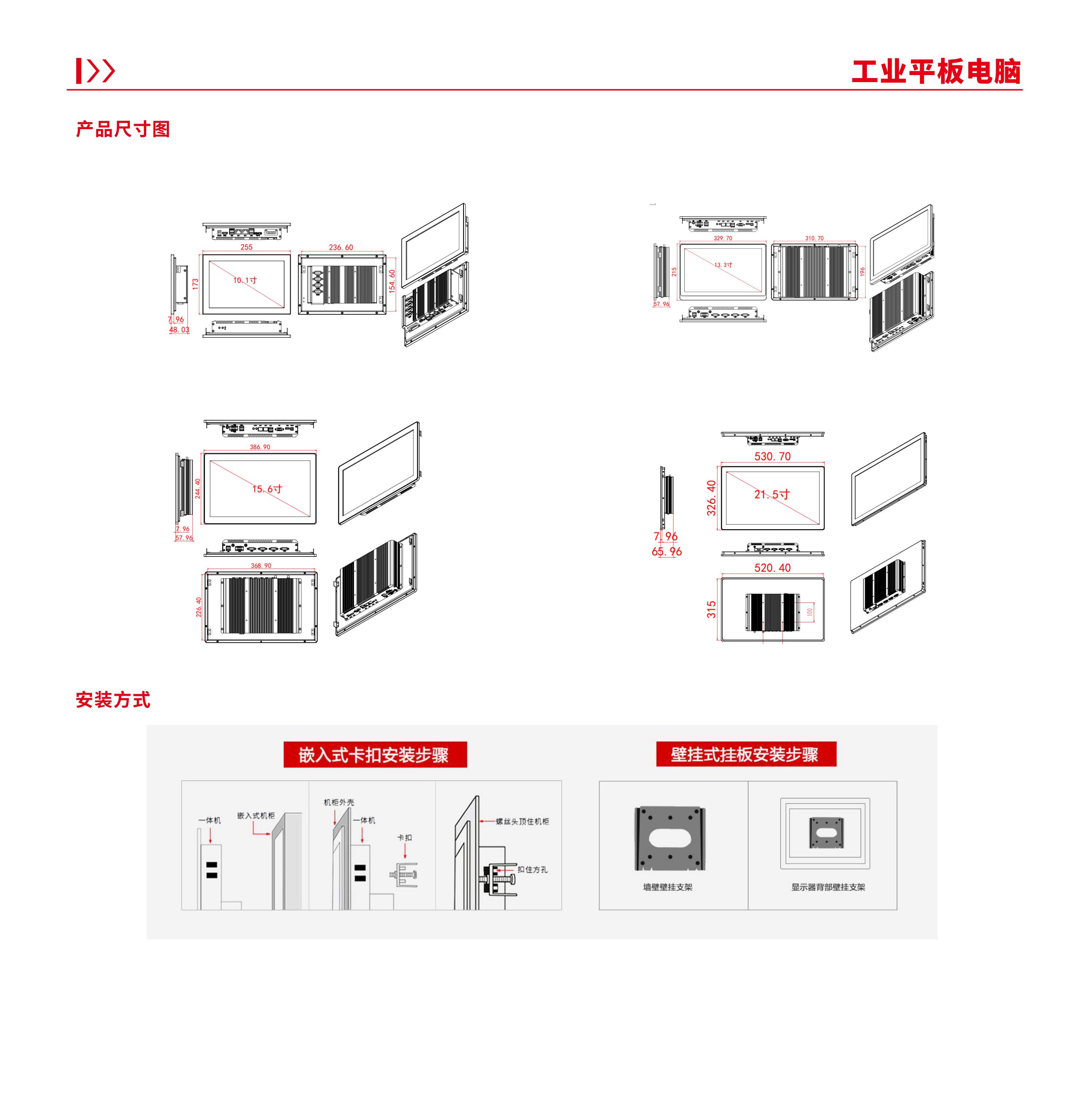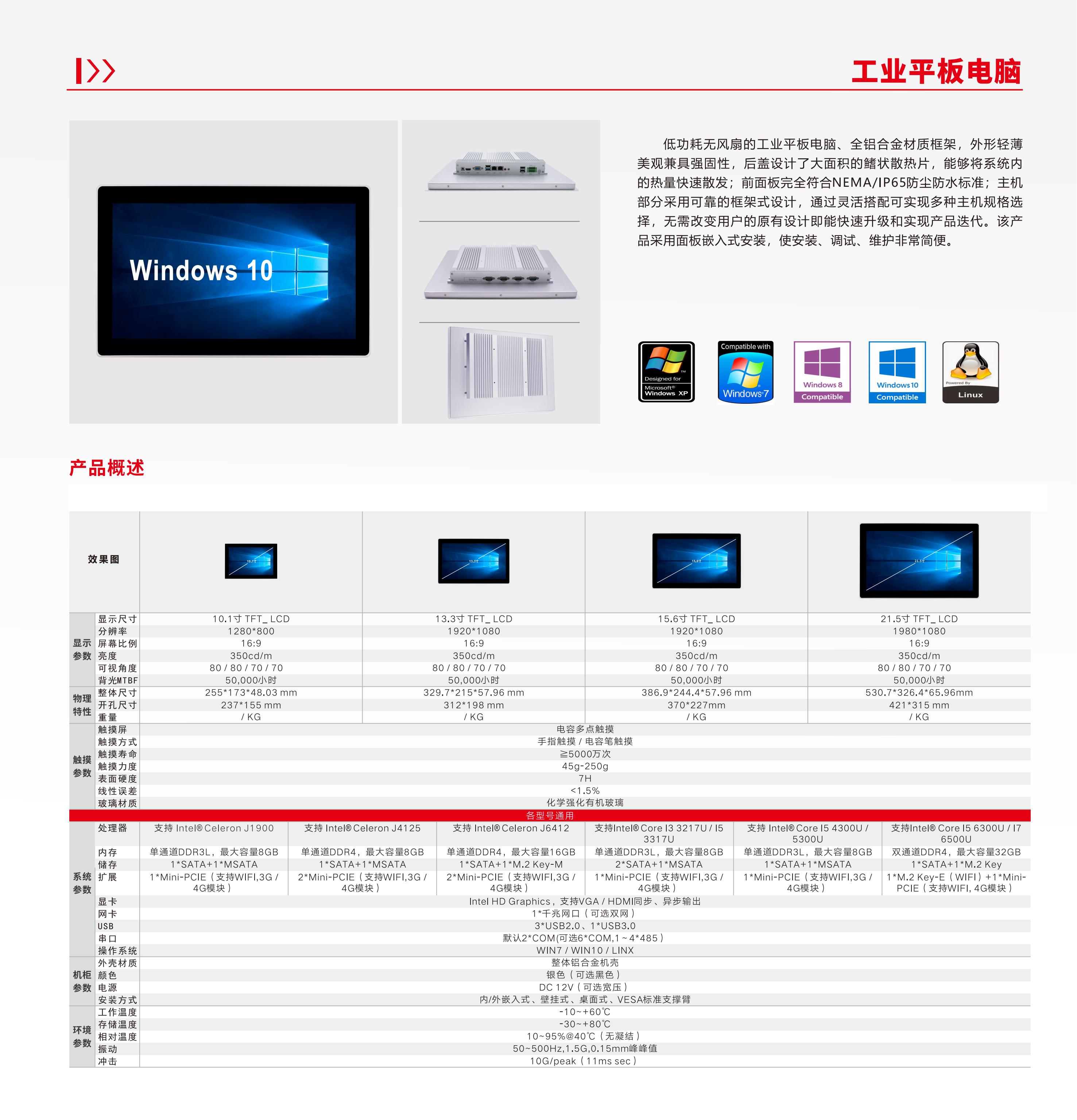 低功耗无风扇的工业平板电脑、全铝合金材质框架,外形轻薄 美观兼具强固性,后盖设计了大面积的鳍状散热片,能够将系统内 的热量快速散发;前面板完全符合NEMA/IP65 防尘防水标准;主机 部分采用可靠的框架式设计,通过灵活搭配可实现多种主机规格选 择,无需改变用户的原有设计即能快速升级和实现产品迭代。该产 品采用面板嵌入式安装,使安装、调试、维护非常简便。