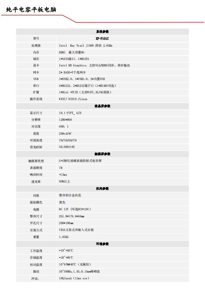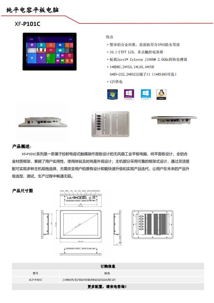 XF-P101C系列是一款基于投射电容式触摸操作面板设计的无风扇工业平板电脑,纯平面板设计、全铝合金材质框架,兼顾了用户实用性、使用体验及时尚是外观设计;主机部分采用可靠的框架式设计,通过灵活搭配可实现多种主机规格选择,无需改变用户的原有设计即能快速升级和实现产品迭代,让用户在未来的产品升级选型、测试、生产过程中畅通无阻。