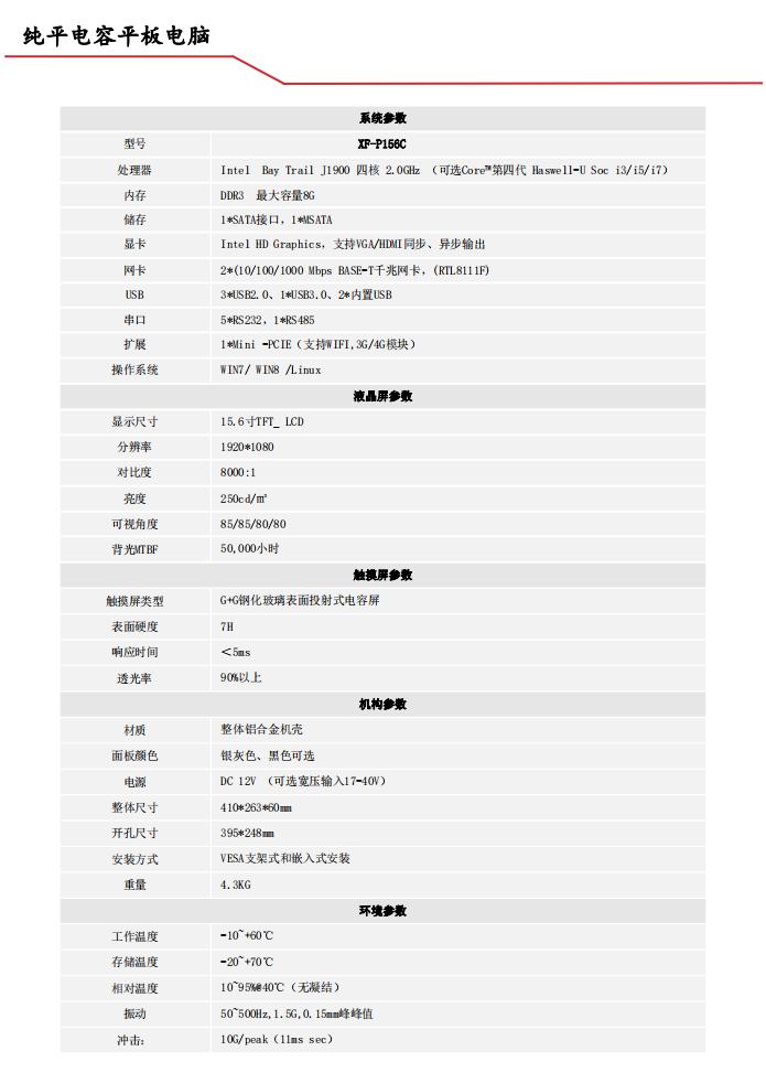 XF-P156C系列是一款基于投射电容式触摸操作面板设计的无风扇工业平板电脑,纯平面板设计、全铝合金材质框架,兼顾了用户实用性、使用体验及时尚是外观设计;主机部分采用可靠的框架式设计,通过灵活搭配可实现多种主机规格选择,无需改变用户的原有设计即能快速升级和实现产品迭代,让用户在未来的产品升级选型、测试、生产过程中畅通无阻。