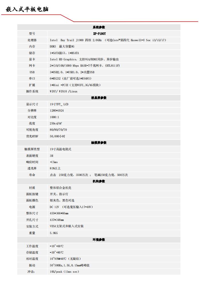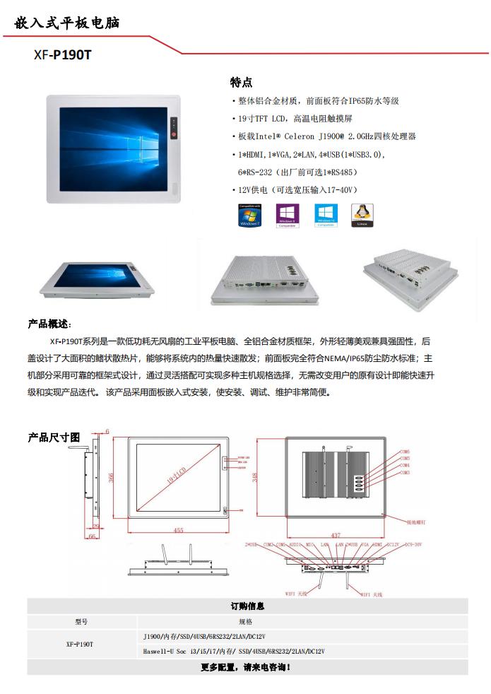 XF-P190T系列是一款低功耗无风扇的工业平板电脑、全铝合金材质框架,外形轻薄美观兼具强固性,后盖设计了大面积的鳍状散热片,能够将系统内的热量快速散发;前面板完全符合NEMA/IP65防尘防水标准;主机部分采用可靠的框架式设计,通过灵活搭配可实现多种主机规格选择,无需改变用户的原有设计即能快速升级和实现产品迭代。该产品采用面板嵌入式安装,使安装、调试、维护非常简便。
