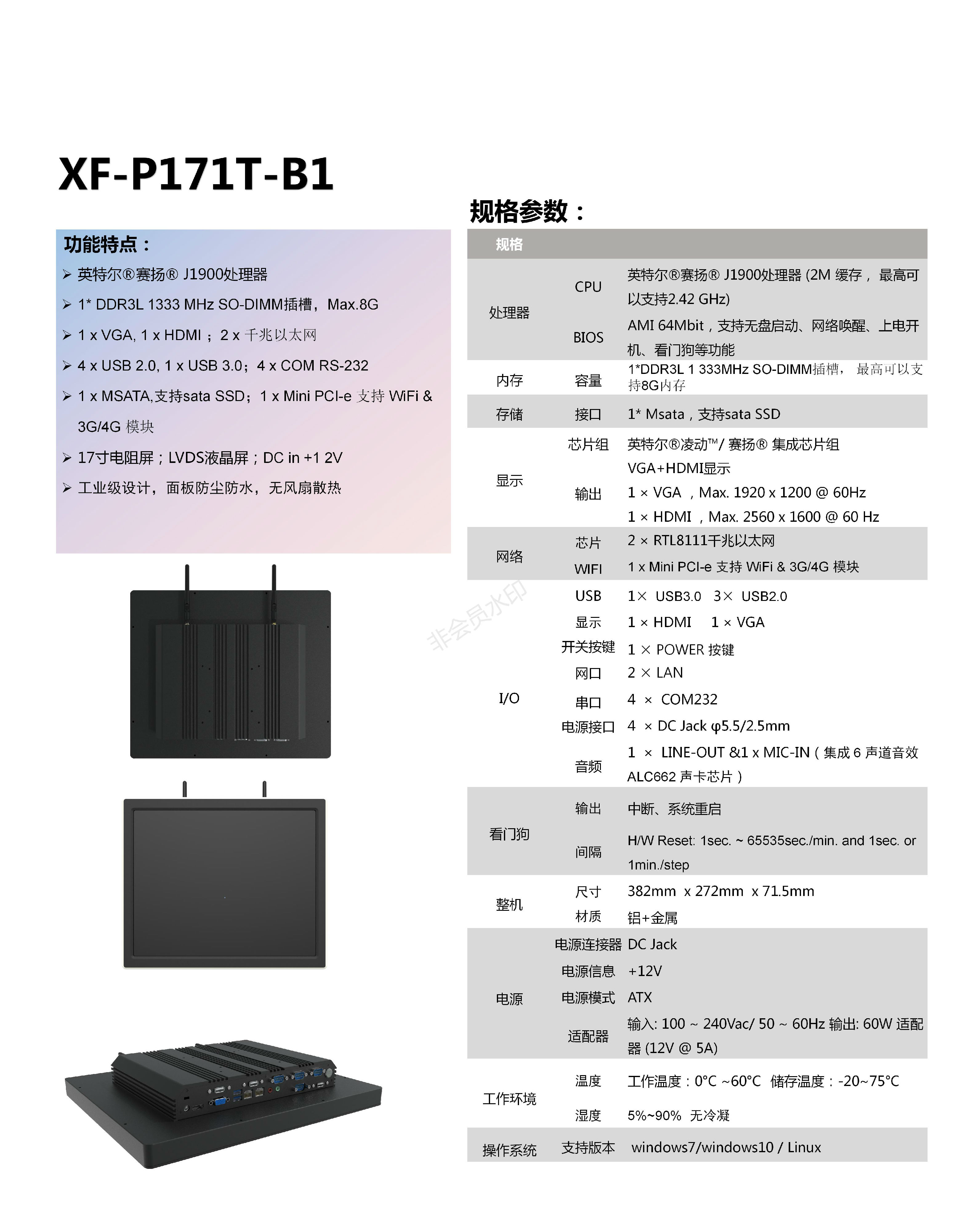 英特尔®赛扬® J1900处理器1* DDR3L 1333 MHz SO-DIMM插槽,Max.8G1 x VGA, 1 x HDMI ;2 x 千兆以太网4 x USB 2.0, 1 x USB 3.0;4 x COM RS-2321 x MSATA,支持sata SSD;1 x Mini PCI-e 支持 WiFi & 3G/4G 模块17寸电阻屏;LVDS液晶屏;DC in +1 2V工业级设计,面板防尘防水,无风扇散热