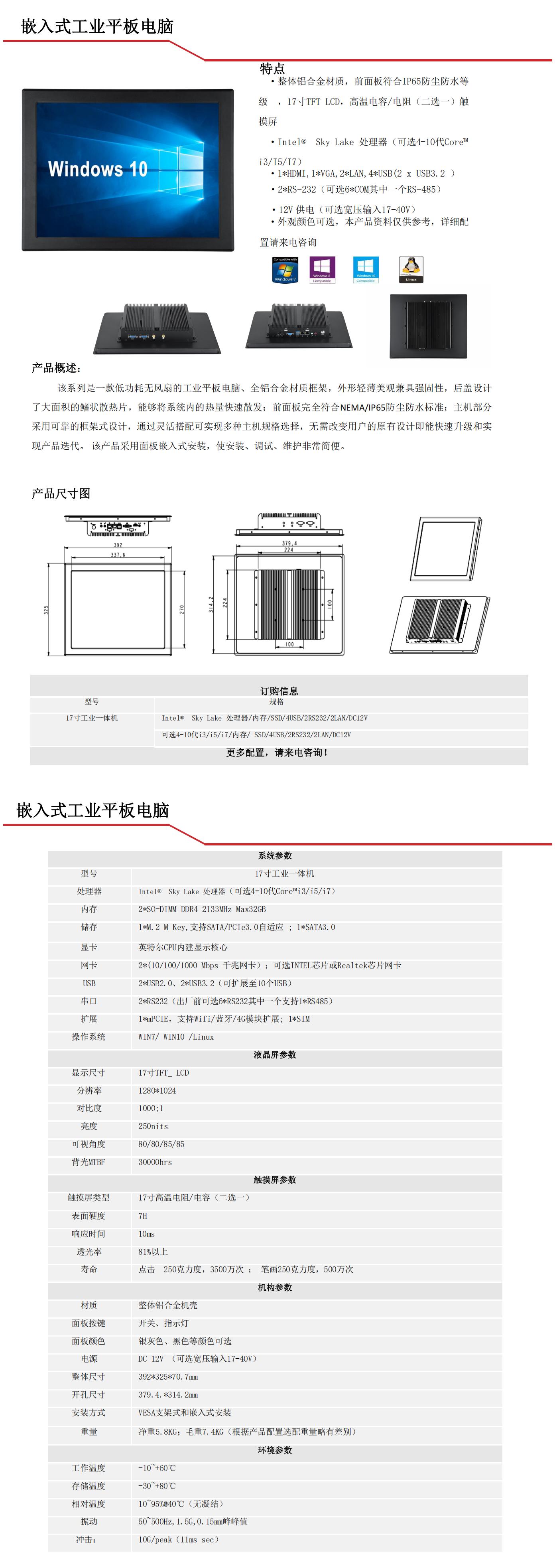 17寸工业电阻屏;LVDS工业液晶屏;DC in +12V 供电(可选宽压输入17V-40V)